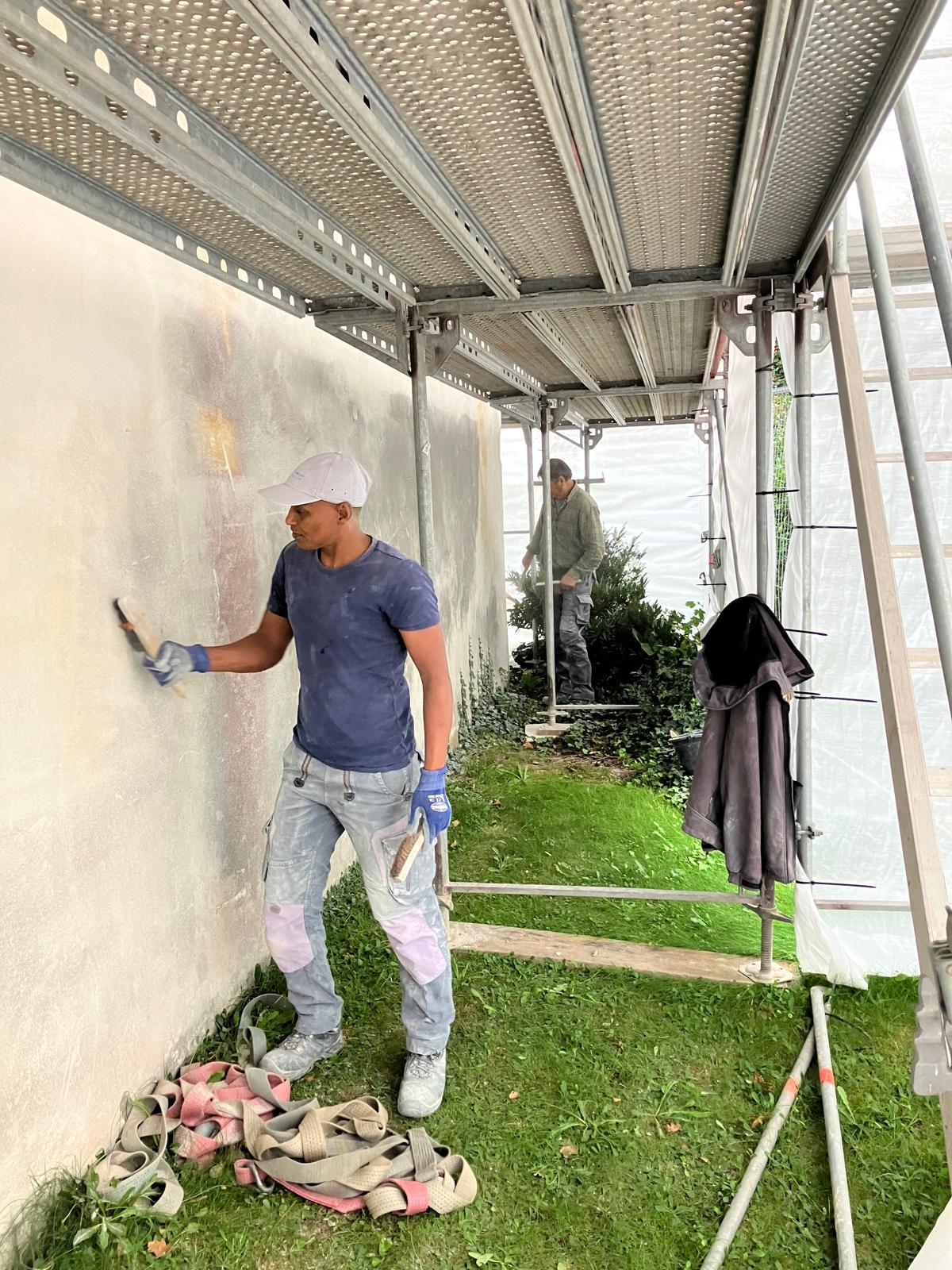 Nach mehrjährigen Vorbereitungen und dem Gerüstbau im August sind nun die Handwerker am Kirchturm aktiv: Grundlegende Putzreinigung und Ausbesserungsarbeiten sind wichtig zur Substanzerhaltung. Wie gut, dass es jetzt weitergeht!